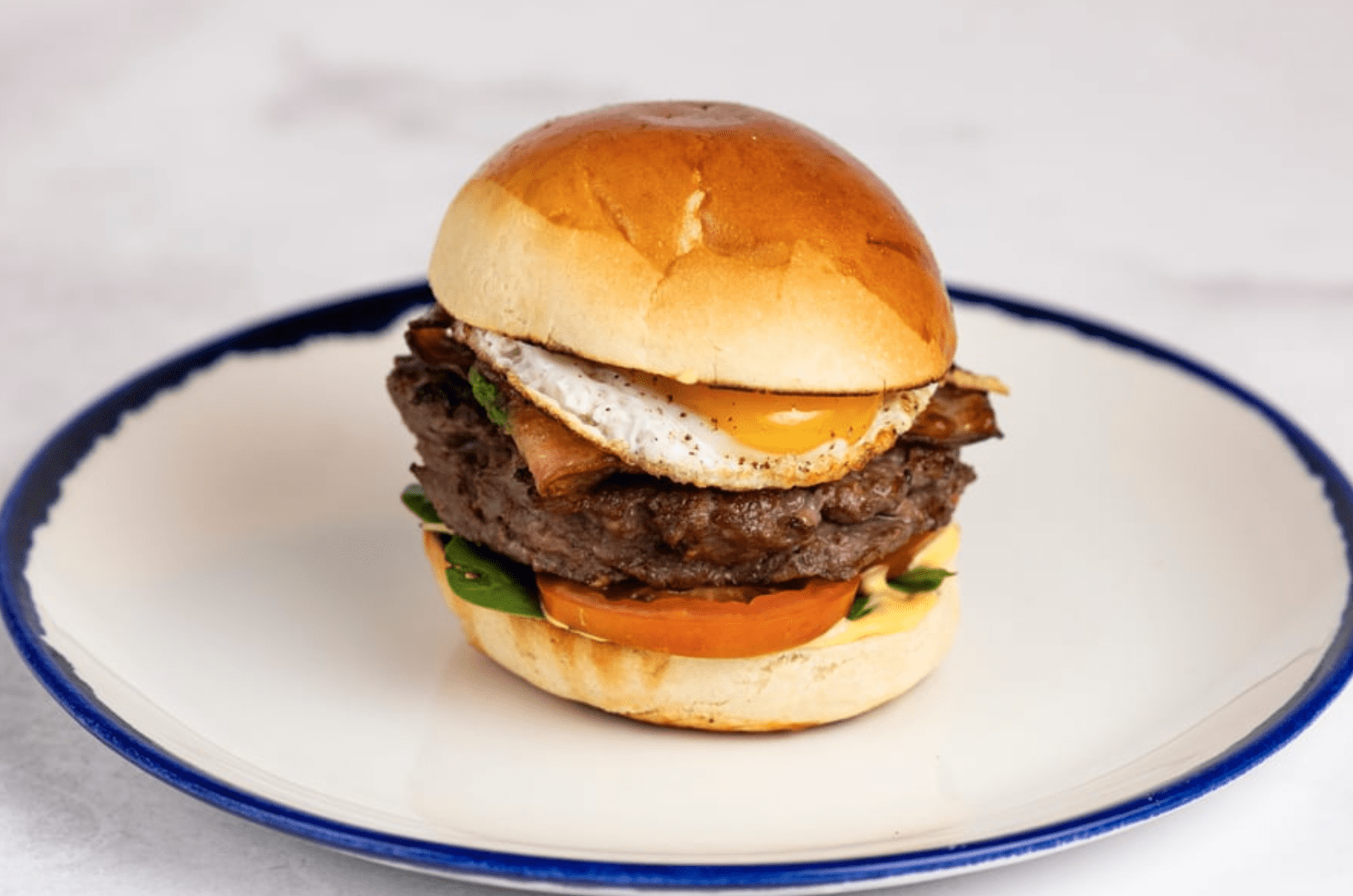 Vyzrálé hovězí maso z české stračeny, uzená slanina, modrý sýr, karamelizovaná cibulka, rukola, chilli majonéza (1, 3, 7, 10) (160g)